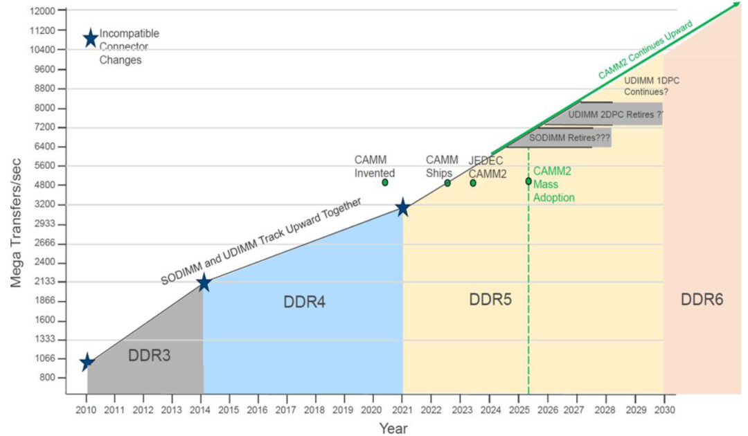 可以看到,JEDEC 在 2021 年的时候发布了 CAMM2 模组,尝试解决 SODIMM 的系统级问题,CAMM2 从性能、尺寸、布线难度、可替换性、EMC 噪声等多方面进行了改进,后续章节会详细介绍。