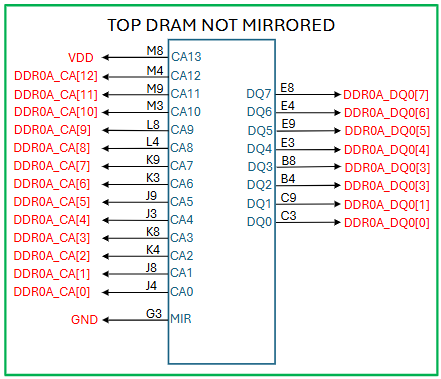 当 MIR 引脚连接到 VDD 时,DDR5 DRAM 会被镜像。CA 和 DQ 网络需要被镜像。要进行镜像,交换 SoC 网络 CA[0] 和 CA[1]、CA[2] 和 CA[3]、CA[4] 和 CA[5]、CA[6] 和 CA[7]、CA[8] 和 CA[9]、CA[10] 和 CA[11],以及 CA[12] 和 VDD。