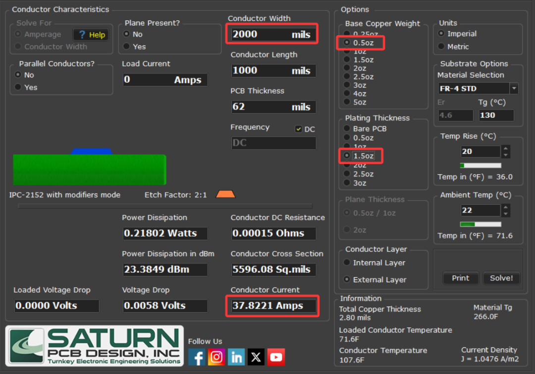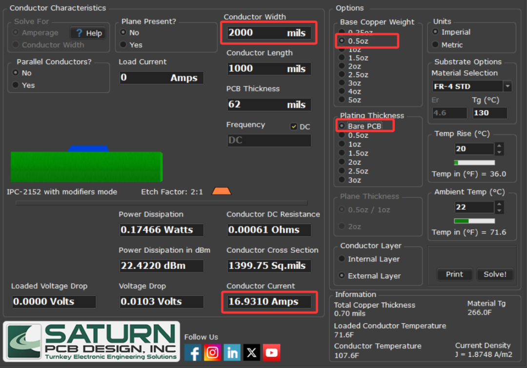 IPC-2152(印制电路板载流量标准)是计算导体宽度和温升关系的权威指南。使用 Saturn PCB Toolkit,通过输入走线宽度、铜箔厚度等核心参数,可以计算出走线允许的最大电流。以下是几个值得关注的参数: