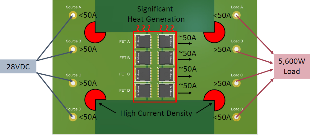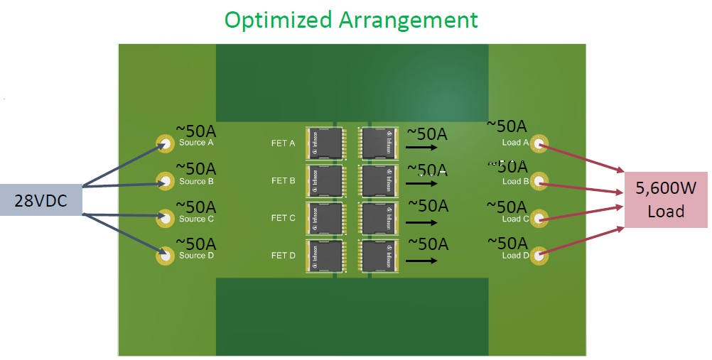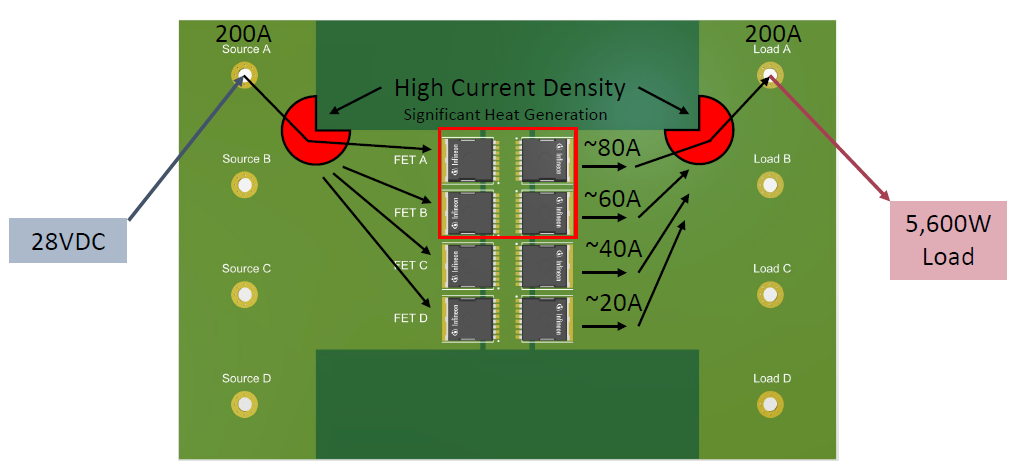由于 FET A 和 FET B 距离路径最近,它们将承载绝大部分电流(例如~80A和~60A),而 FET D 可能只承载 ~20A。