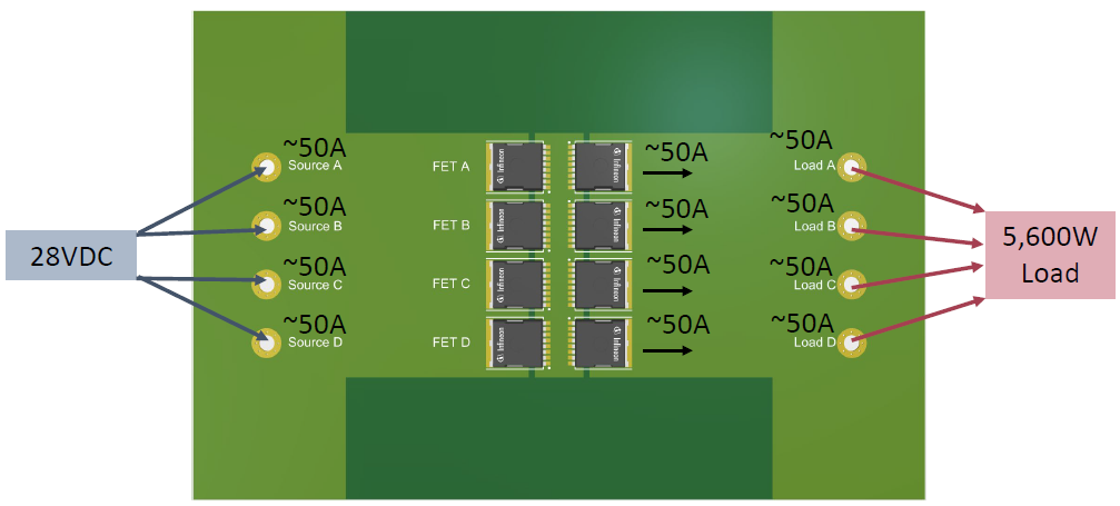 - 在最大负载下,大功率路径将承载 200A 电流。