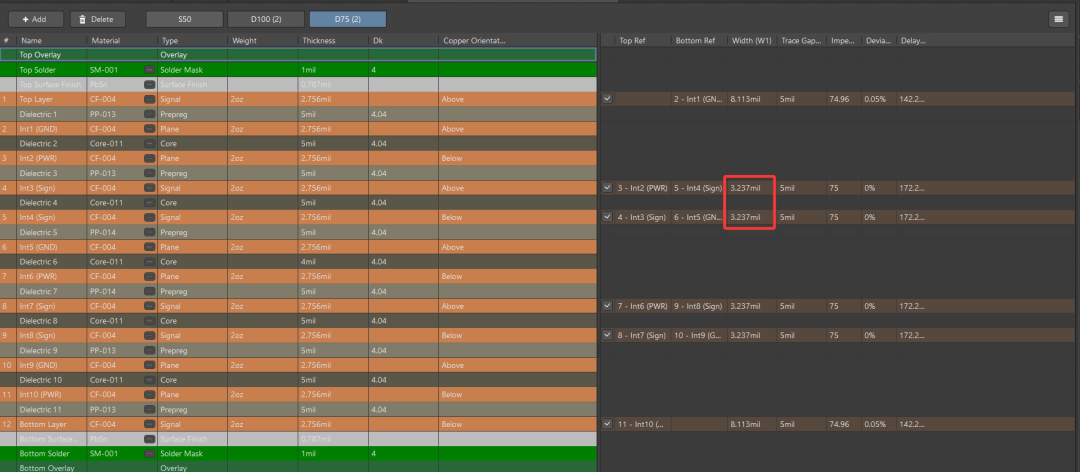 假设在内层为了实现差分对 75Ω 或 100Ω 阻抗,计算出的走线宽度会非常细。分别为 3.237 mil 及 0.656mil。单端的更是无法实现。
