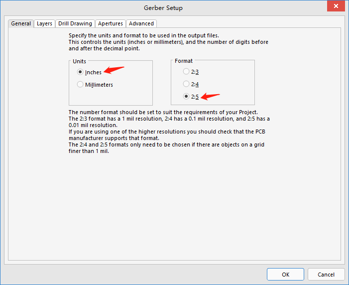 执行菜单命令【File】→【Fabrication Output】→【Gerber Files】→【Gerber Setup】窗口。1、【General】对话框设置→【Units】输出单位选择→选择【Inches】→然后【Format】输出精度选择→选择【2:5】。如图2所示。