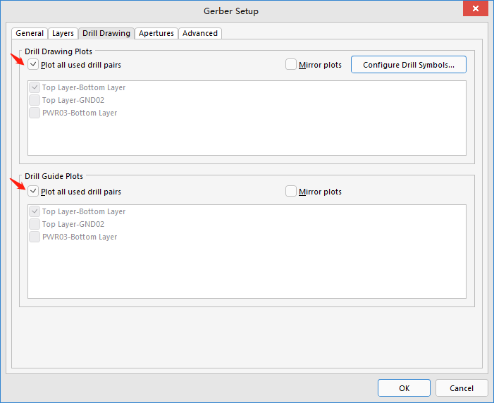 4、【Drill Drawing】对话框设置→【Drill Drawing Plots】和【Drill Guide Plots】