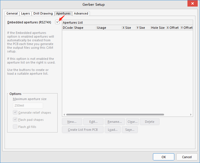 5、【Apertures】默认勾选→【Embedded apertures(RS274X)】使用RS274X文件格式输出,如图5所示。