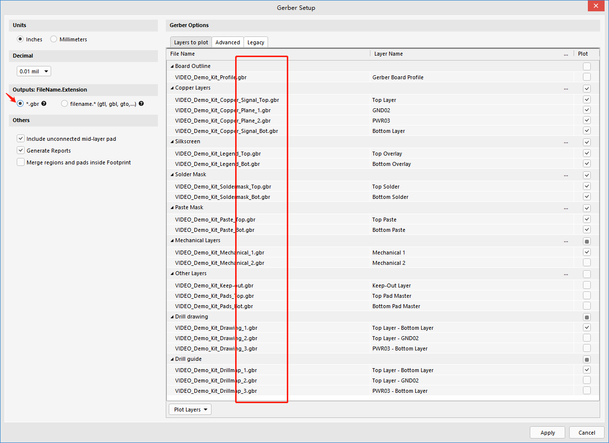 【filename.* (gtl, gbl, gto,...)】:启用此选项以生成具有相同文件名但具有不同扩展名的图层(.gtl、.gbl、.gto、...)。这里就是原来经典的生成Gerber文件的后缀格式。