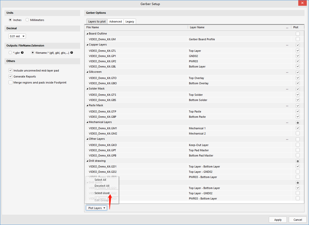 5、【Gerber Options】→ 【Layers to Plot Tab】:此选项卡配置当前 PCB 文档的 Gerber 。这里根据设计文件选择对应出图层即可,也可以在【Plot Layers】菜单→【Select Used】选择已使用的。如图9所示。