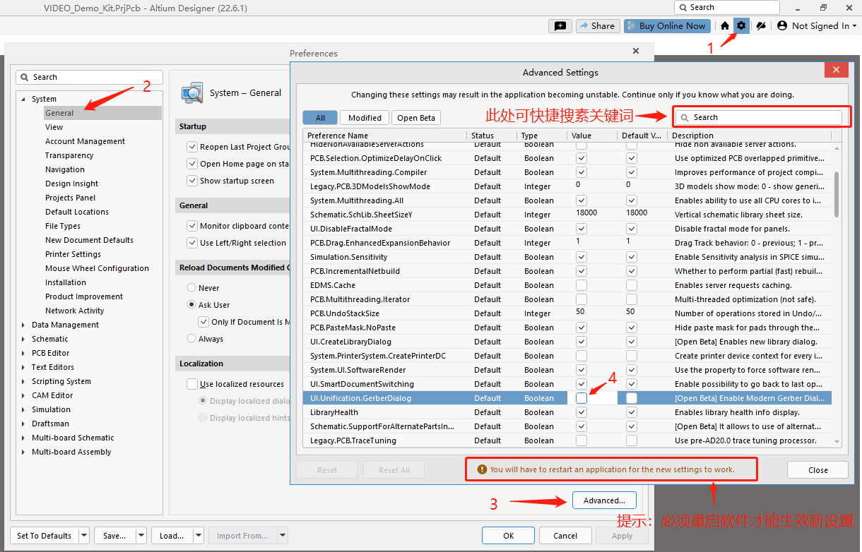 若想要将 AD 输出 Gerber 的工作界面恢复到原来经典的工作界面,可在点击PCB工作面板的设置图标或按步骤【Preference】→【System】→【General】界面中→【Advanced】高级设置→【UI.Unification.GerberDialog】 的启用选项取消✔勾选。如图12所示。