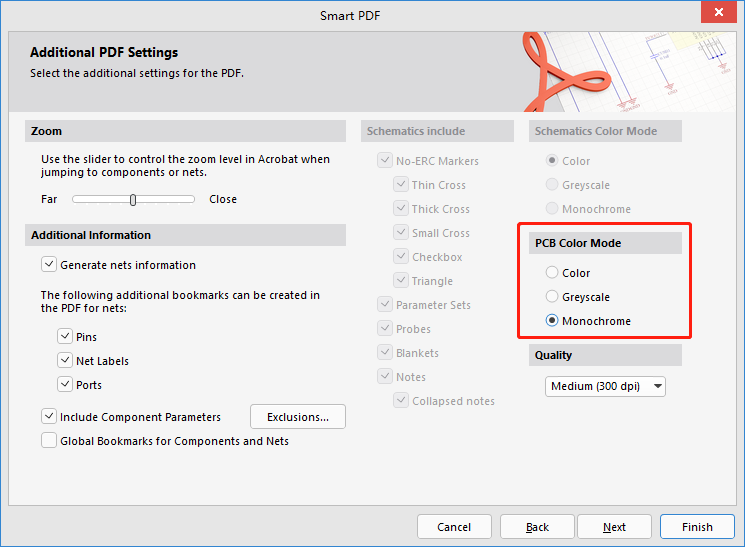 8、【PCB Color Mode】输出颜色选择项设置,可选Color彩色、Creyscale灰色、Monochrome黑白,通常没有特殊要求选择黑白色即可,当然也可根据需要选择。然后单击【Finish】完成按钮,完成装配图的PDF文件输出。如图23所示。