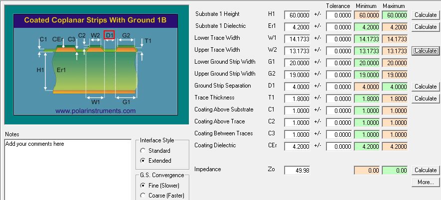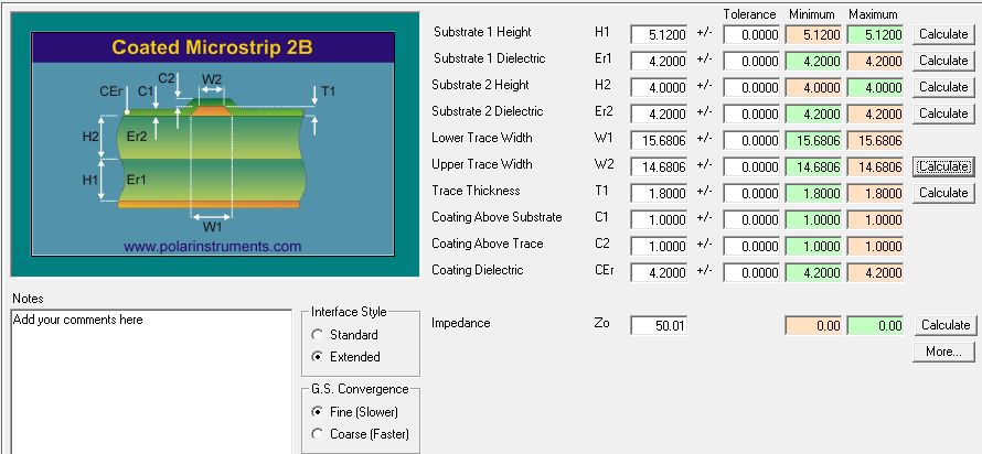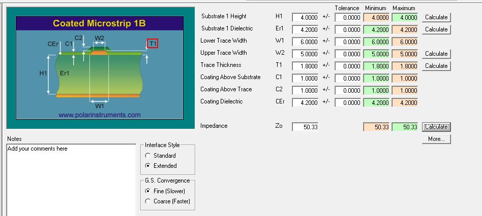 (3)表层(Top/Bot层)射频信号50欧姆阻抗的计算: