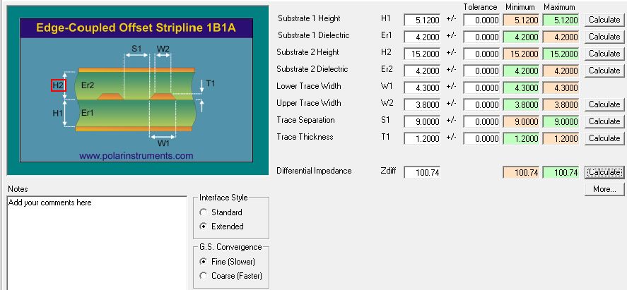 (2)带状线(Art03和Art06层)内层差分阻抗选用Edge-Coupled Offeset Stripline模型 1B1A,100差分欧姆阻抗计算方法如图6所示,计算出来的内层100欧姆差分线宽线距为4.3/9mil。
