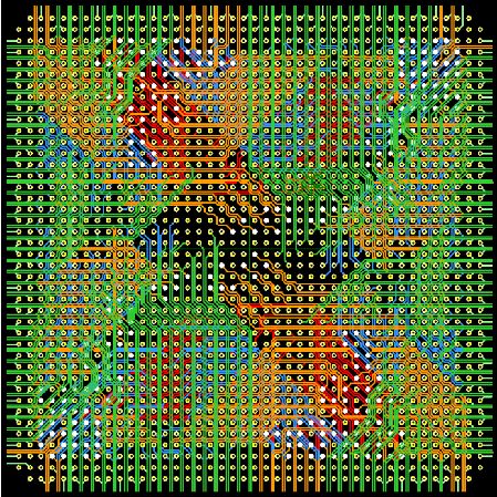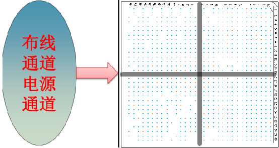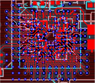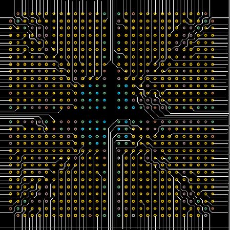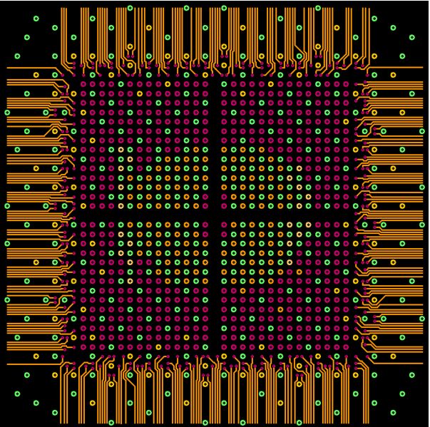 (3)将BGA由中心以十字划分,VIA分别朝左上、左下、右上、右下方向打,中间预留十字通道。