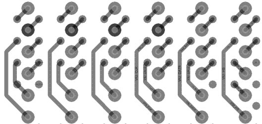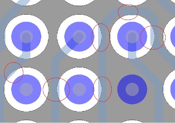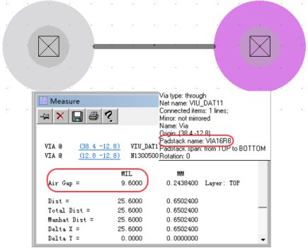 当使用外径为16mil,内径为8mil的过孔时,两过孔的空气间隙为9.6mil,如果使用常规工艺的最小线宽4mil,除去走线的宽度,两过孔间剩余的距离为5.6mil,线到过孔的距离才2.8mil,不满足常规工艺。所以在这种布线环境下,两过孔间是不能过线的。