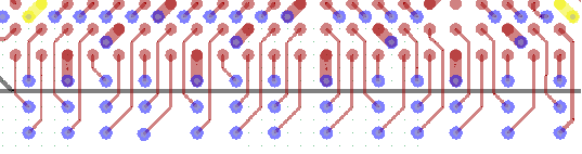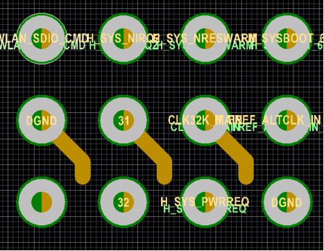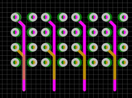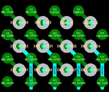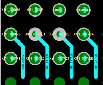 (1)所以使用VIA16R8的过孔适用于BGA不深,出线较少的时候可以通过调整fanout来出线(避免两过孔直接相邻)。这种情况可以设常规线宽5mil,线到线的距离5mil,线到过孔的距离5mil。规则可以根据扇出和出线方式做适当调整,但是要能满足常规工艺,下图扇出方式,两过孔间(VIA16R8)能过三根5mil的线