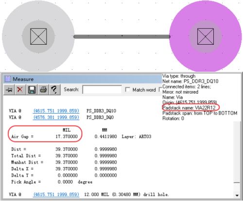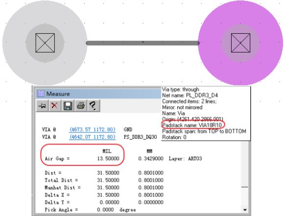 1.0的BGA如果有需要,两过孔间可以过两根线。这个时候需要用尺寸较小的过孔,可以使用外径为18mil,内径为10mil的过孔。过孔与过孔的空气间隙为21.37,如果过两根线,线宽只能为4mil,线到线的距离为4mil,线到过孔的距离为4mil。