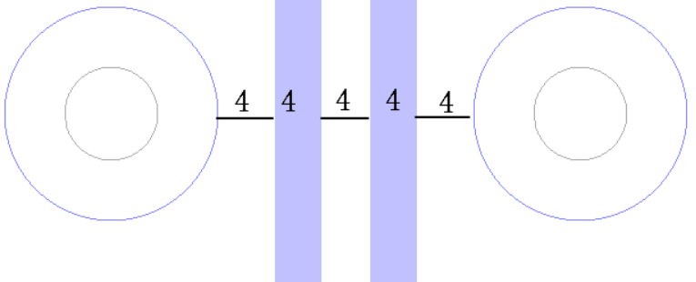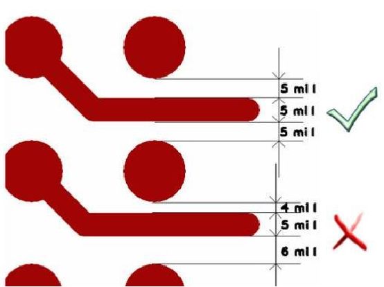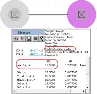 当使用外径为14mil,内径为8mil的过孔时,两过孔的空气间隙为11.5mil,内层走线为3.5mil,除去走线的宽度,两过孔间剩余的距离为8mil,线到过孔的距离可以设为4mil