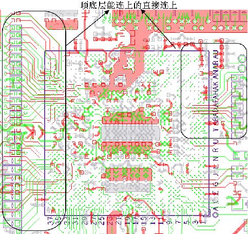 (8)为减少内部出线压力,预留背面放置滤波电容或其他器件的空间,BGA Fanout原则要减少BGA内过孔数,尽可能将BGA前两排过孔拉出外面打孔,BGA与周边电路的互连能用顶层连上的直接连上。