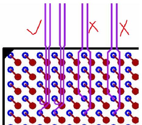 (5)差分信号两端完全并行走线引入BGA管脚内,尽量避免一对差分走各自通道进入BGA管脚内。