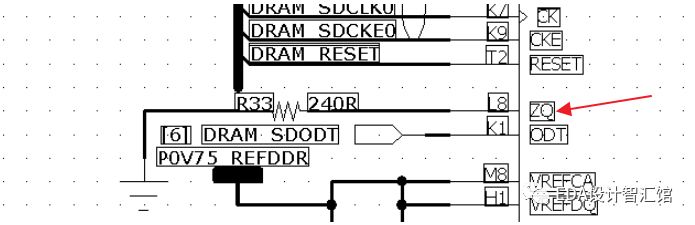 在我们的电路设计中,按照 DDR3 的标准,在 ZQ 脚上是通过 240ohm,1%的电阻拉低来计算 ODT 阻抗的。如下图。