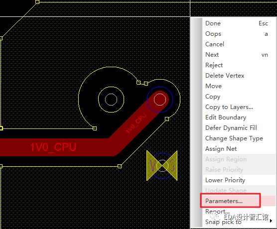 执行避让操作前,先选择铜皮,然后右键,在右键菜单栏中选择Parameters,如下图。