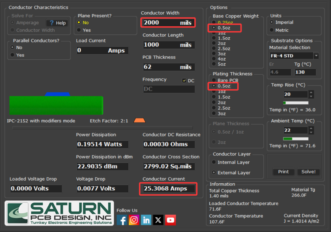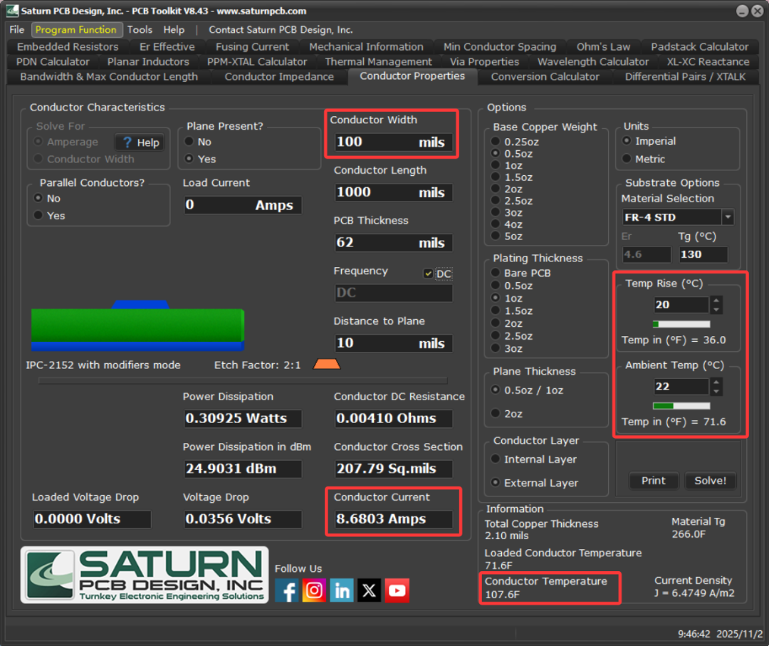 IPC-2152(印制电路板载流量标准)是计算导体宽度和温升关系的权威指南。使用 Saturn PCB Toolkit,通过输入走线宽度、铜箔厚度等核心参数,可以计算出走线允许的最大电流。以下是几个值得关注的参数: