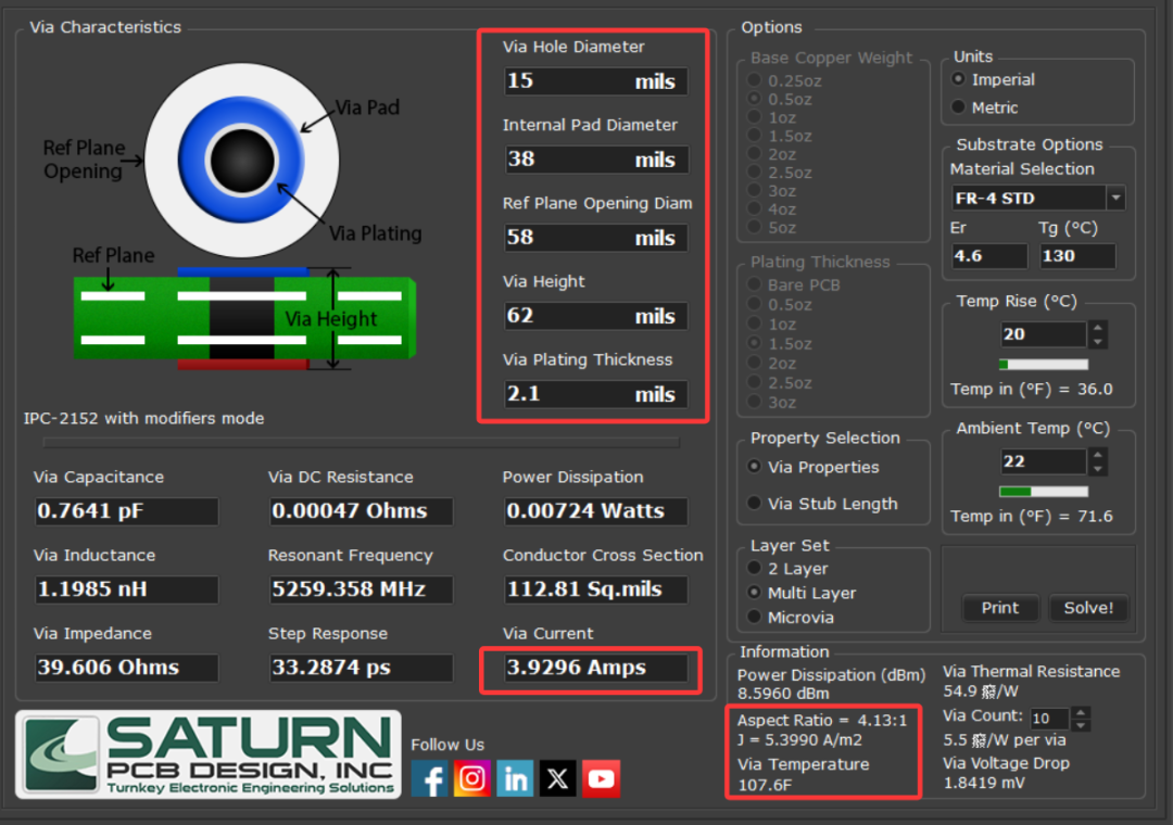 单个过孔的载流量同样可以使用 IPC-2152 计算器(如Saturn PCB Toolkit)得出。例如,一个 15mil 钻孔、2.1mil 镀层厚度的过孔,在 20°C 温升下约承载 3.9A。