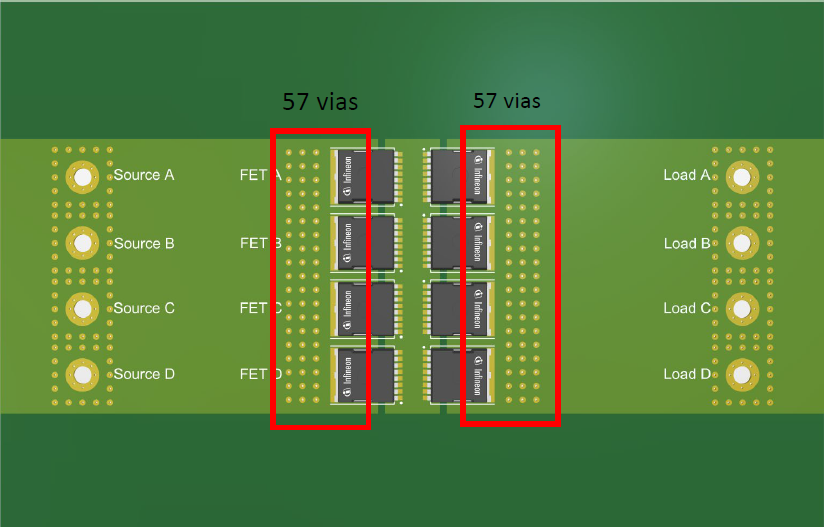 需要使用负载分配过孔(或:均流过孔)将电流传输至贴片 FET。在贴片 FET 周围均匀地分布过孔。采用 100% 负载(计算)和 50% 的 de-rating。为了提高可靠性,最少需要 52 个过孔。