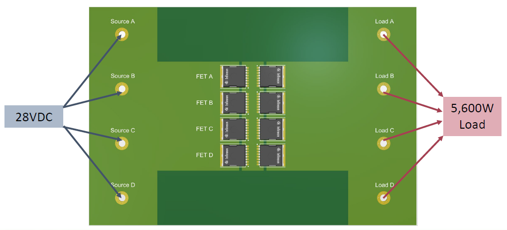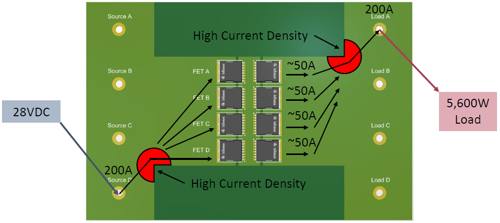由于 FET A 和 FET B 距离路径最近,它们将承载绝大部分电流(例如~80A和~60A),而 FET D 可能只承载 ~20A。