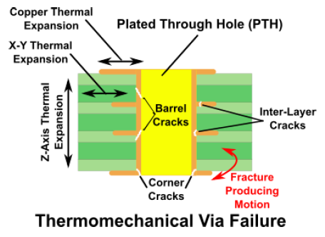 在热循环过程中,电镀通孔 (Plated Through Holes, PTH) 会产生疲劳,如果 Z 轴膨胀不受控制,(这些通孔)可能会失效。
