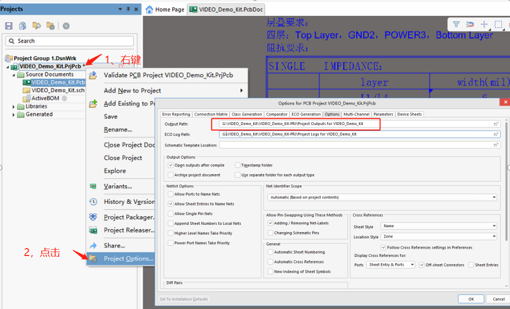输出文件的位置是由 【Projects】 工作面板中的工程名称处鼠标右键菜单后点击 【Project Options】→【Options-Output Path】路径来决定的。若设计中的 PCB 文件是单独的文件,没有保存在一个工程内,此时生成的 Gerber 文件会保存于 PCB 文件所在文件夹内。 如图11所示。