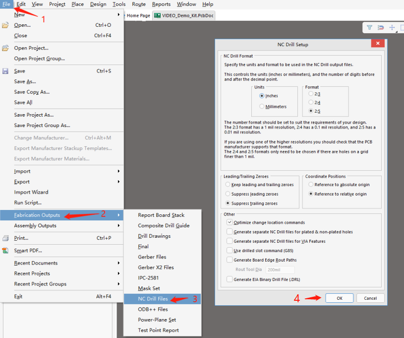 执行菜单命令【File】→【Fabrication Output】→【NC Drill Files】,进入钻孔文件的输出设置工作界面,通常选择默认设置即可点击【OK】按钮即可输出钻孔文件。如图13所示。