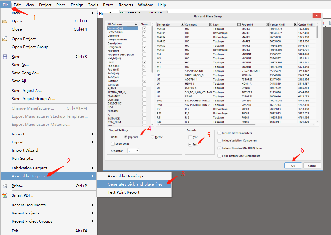 在菜单栏点击【File】→【Assembly Outputs】→【Generates pick places files】,进入贴片坐标文件的设置窗口,【Units】单位→选择【Inches】英寸,如需要毫米单位则选择【Metric,Formats】格式→选择【Text输出】→单击【OK】按钮,即可输出坐标文件。如图15所示。