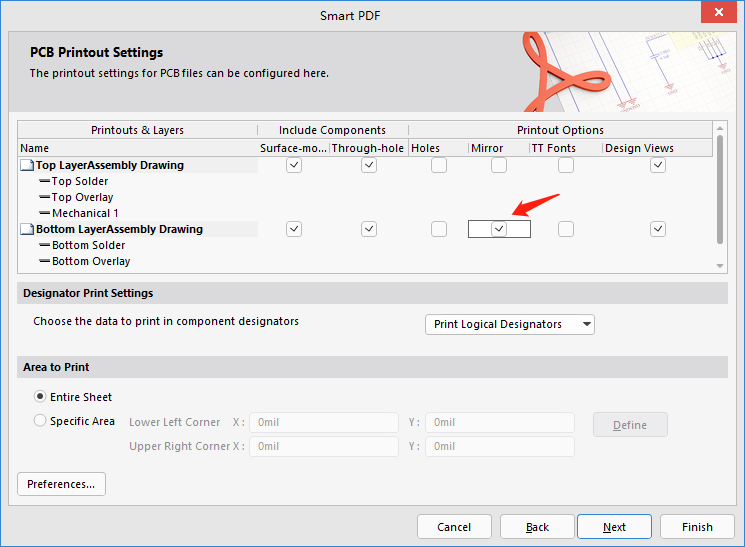 6、在如图21所示的视图设置对话框中,底层装配栏勾选【Mirror】选项,在输出之后观看PDF文件时是顶视图,反之则是底视图。