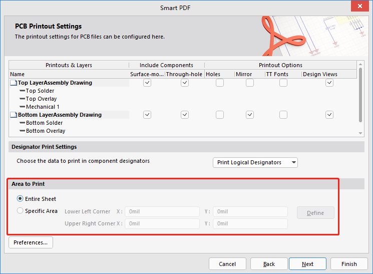 7、【Area to Print】:选择PDF打印范围,这里通常可以不调整,如有需求可选【Specific Area】选项,根据需要的格式尺寸范围调整坐标。如图22所示。